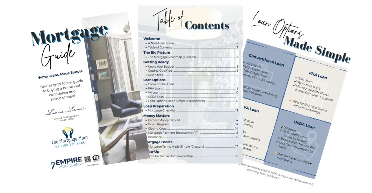 My free mortgage guide breaks down the home loan process in plain English so you know what to expect before you ever apply. It’s designed to help you feel confident, prepared, and in control as you take your next step toward homeownership. Click below if you would like a copy.